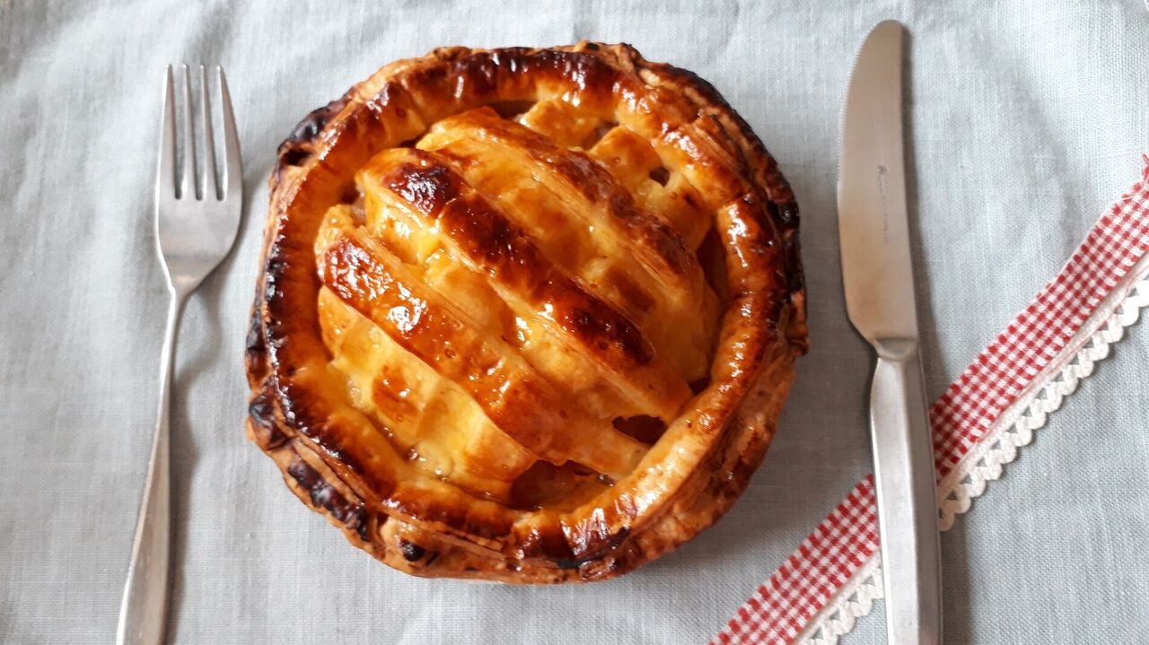 食べてみたところ、味は大きく切ったリンゴの甘味にシナモンの風味がよく効いていて、さらにサクサクのパイが美味しかったです。美味しい物を食べられて癒しの時間でした。