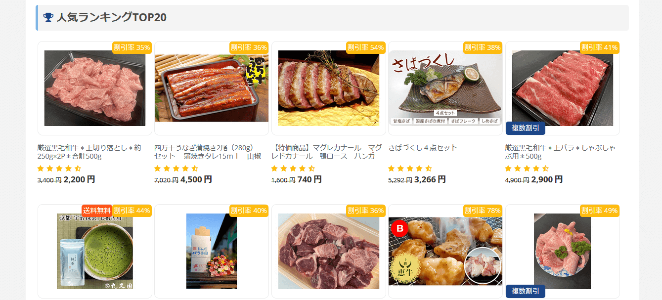 これを見てみると、ランキング上位には肉類や魚介類が多く、どれも割引率が高いことがわかります。