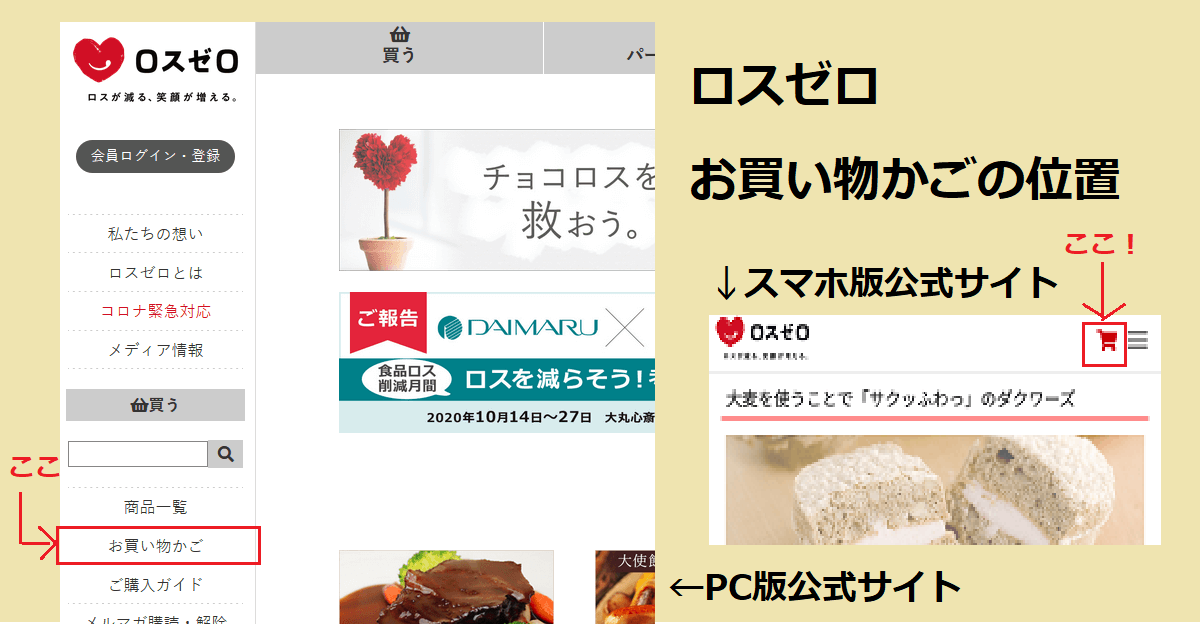 (買い物カゴは、PC版では画面右サイドメニュー(商品一覧の下)スマホ版なら画面右上のメニュー隣にあります)