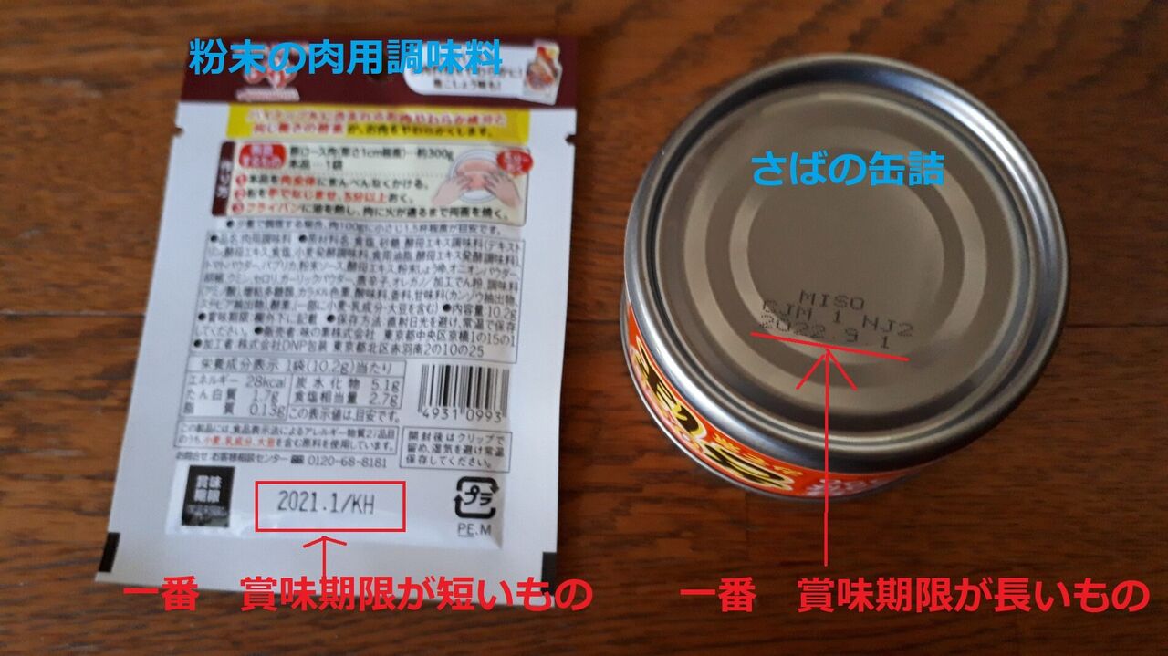実際に全ての商品の賞味期限を確認し、賞味期限が一番長いものと短いものを写真に撮影しました。