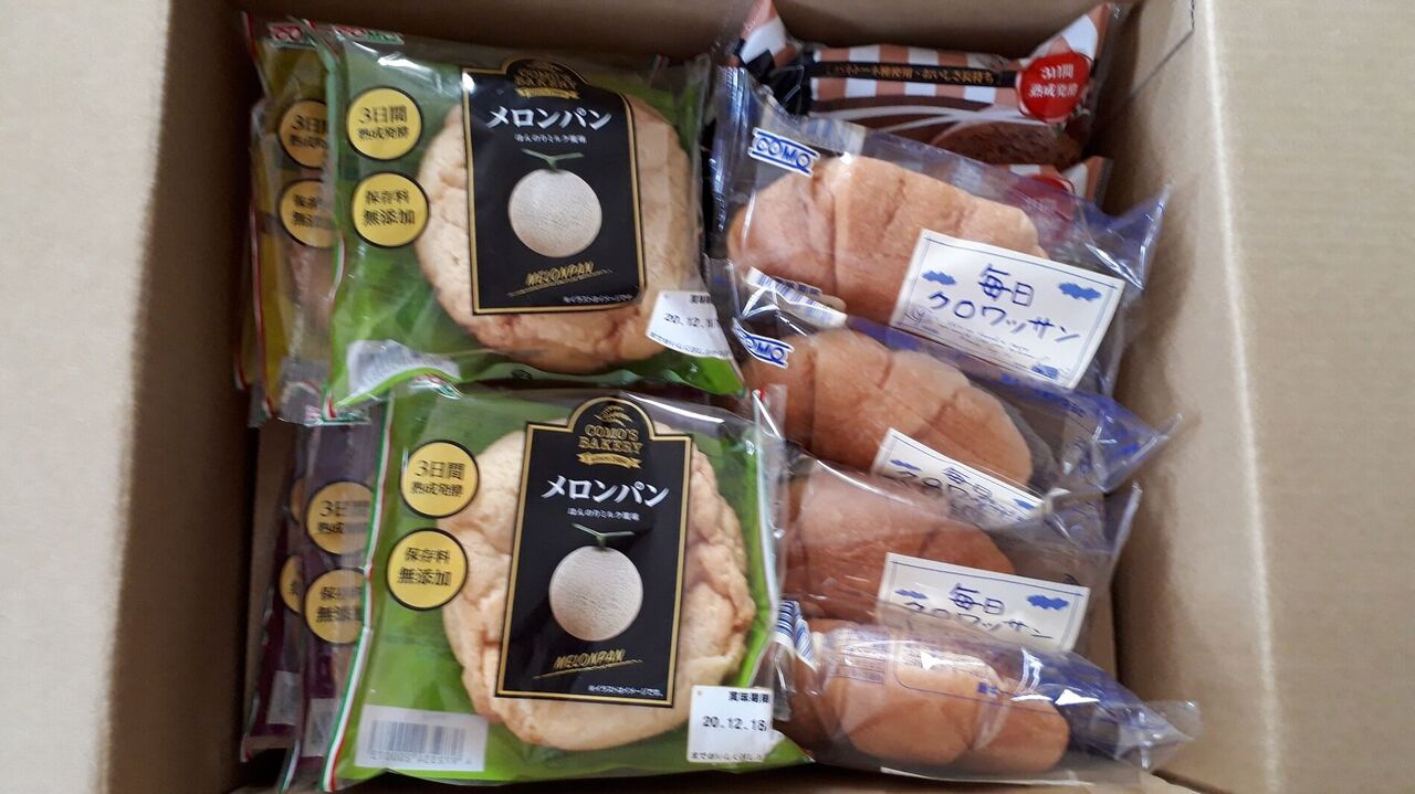(買ったもの:輸入ウエハース菓子、パン、レトルト食品3種)